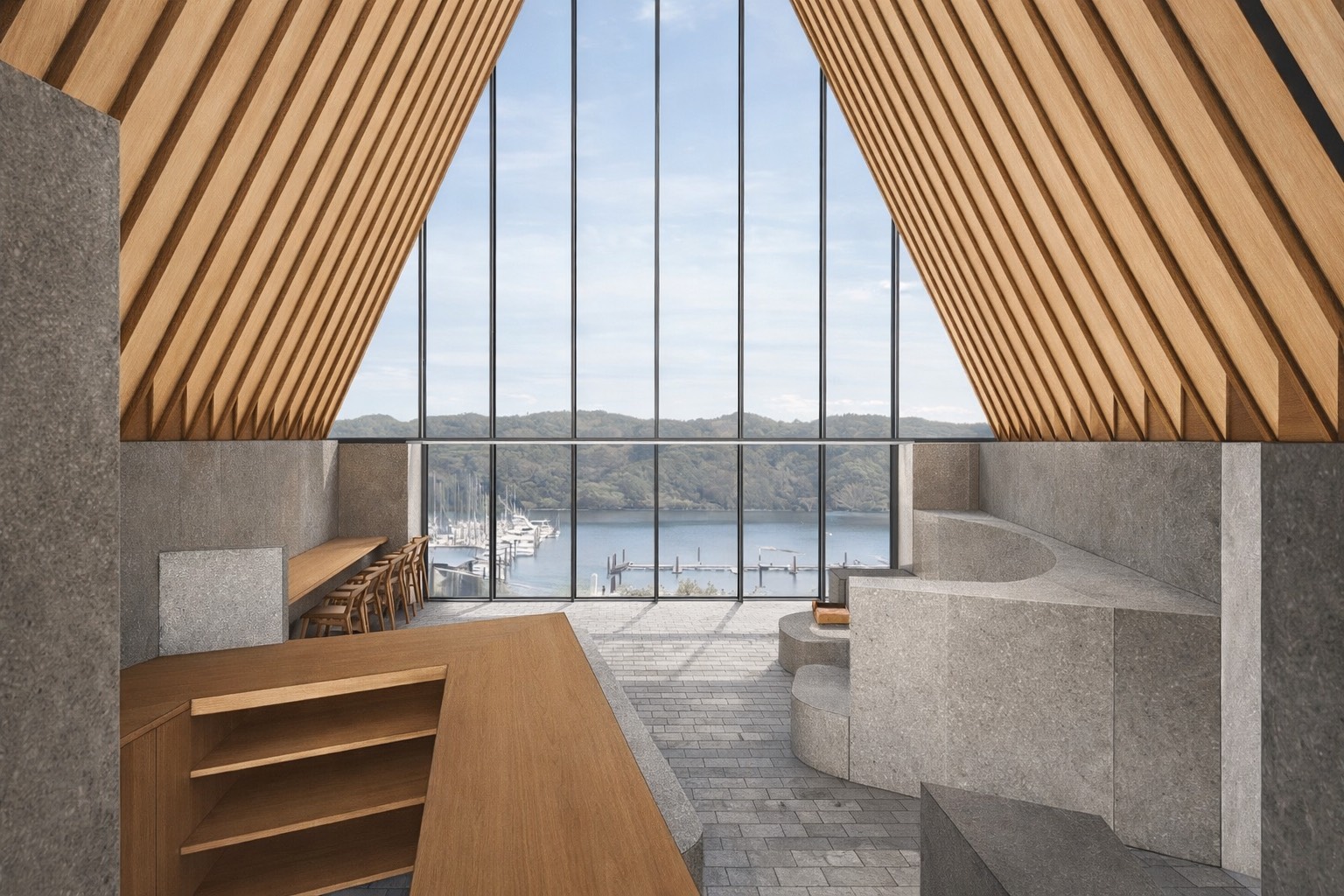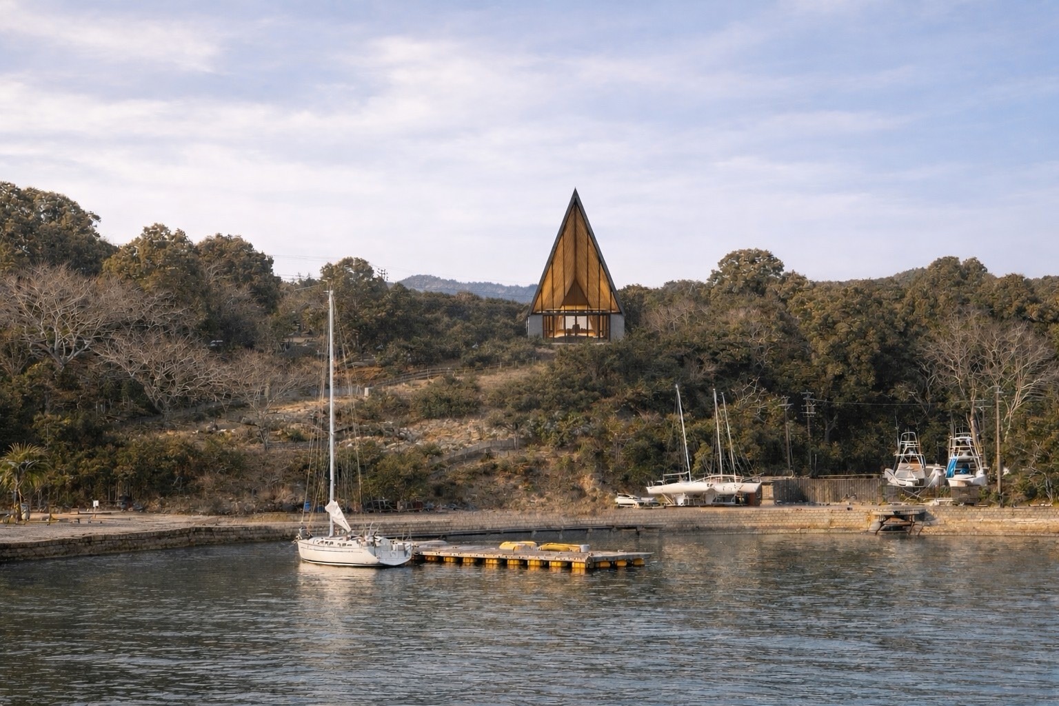 入江からアプローチする洋上のヨットからもこの場所の象徴となるよう形を導いている.